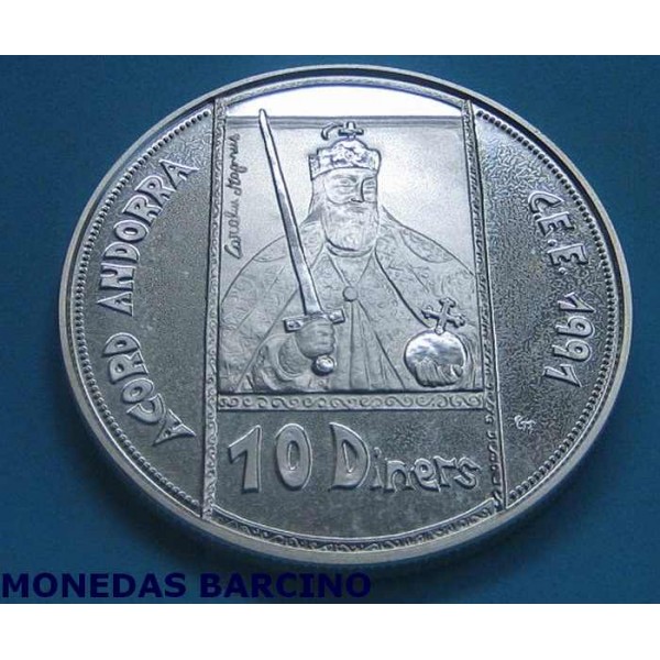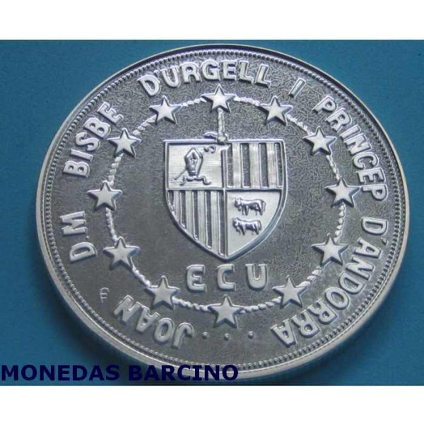 Moneda del Principado de Andorra del año 1991 ANDORRA de valor 10 diners ecu plata Moneda Conmemorativa de Carlo magno Joan D.M. Bisbe De Urgell I Princep de Andorra calidad Proof . la monedade la imagen fotografiada