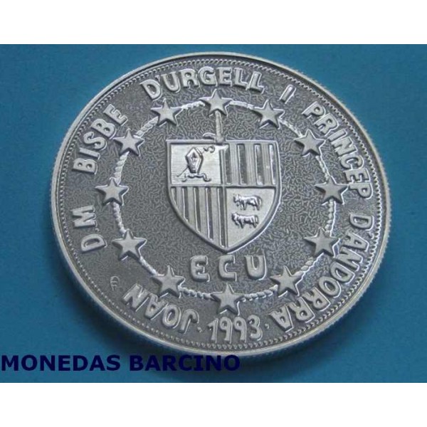 Moneda del Principado de Andorra del año 1993 ANDORRA de valor 10 diners. Ecu. plata 925 mls. Moneda Conmemorativa de St. George Joan D.M. Bisbe De Urgell I Princep de Andorra calidad Proof la monedade la imagen fotografiada