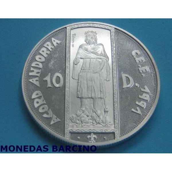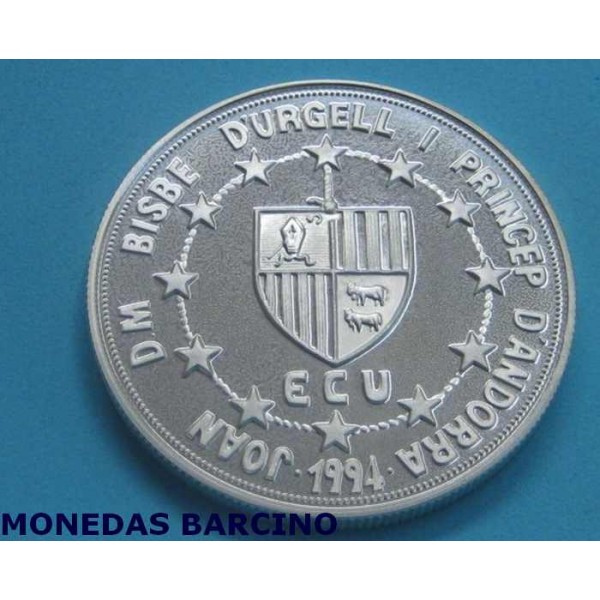 Moneda del Principado de Andorra del año 1994 ANDORRA de valor 10 Diners - Ecu plata 925 mls. Moneda Conmemorativa de Pedro III de Catalunya Cataluña y Aragon Joan D.M. Bisbe De Urgell I Princep de Andorra calidad Proof la moneda de la imagen fotografiada