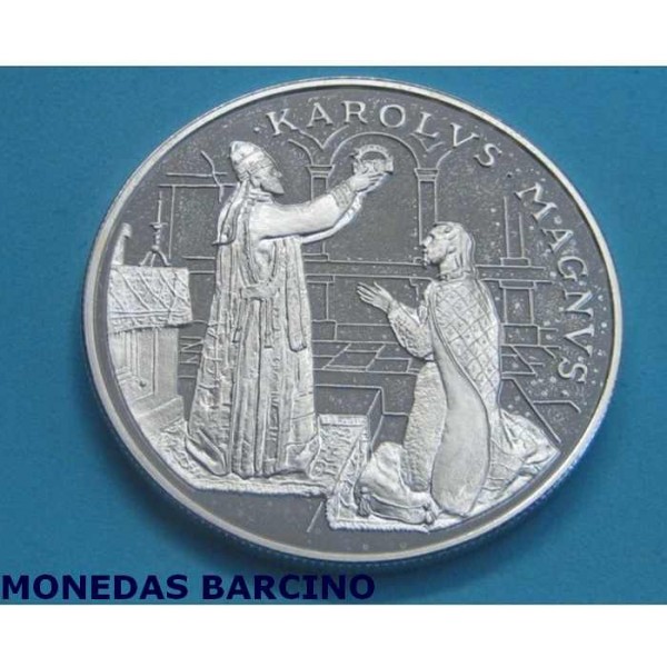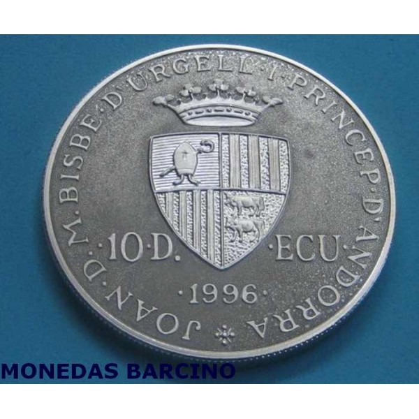 Moneda del Principado de Andorra año 1996 ANDORRA de valor 10 diners ECU plata 925 mls. Moneda Conmemorativa de Carlo Magno. Karolus Magnus Agnus. Joan D.M. Bisbe De Urgell I Princep de Andorra calidad Proof