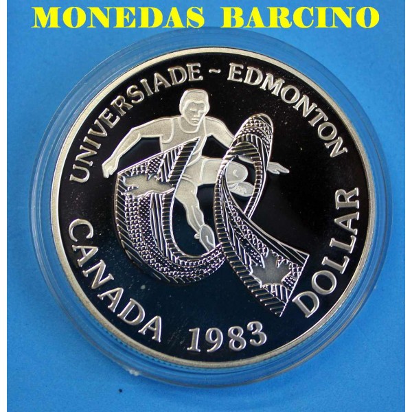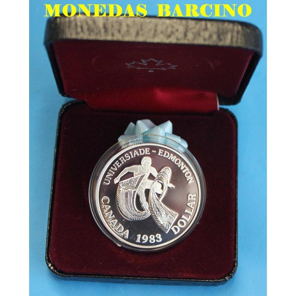 Moneda de canada año 1983 de valor dóllar plata 500 mls Canada Reina Elizabeth II D.G. Regina Moneda conmemorativa Universiade Edmonton Moneda con capsula y estuche clasificacion KM- 138. calidad Proof. LA MONEDA DE LA IMAGEN FOTOGRAFIADO