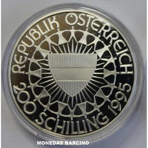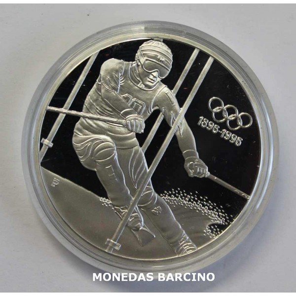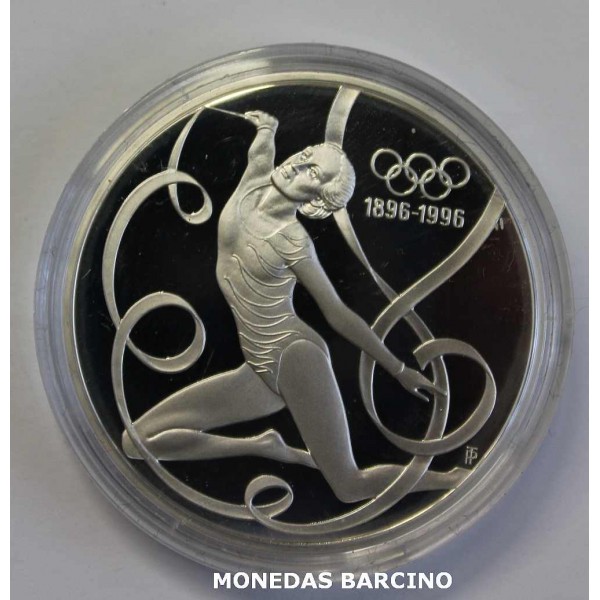 Moneda de Austria año 1995 de valor 200 shilling onza de plata 925 mls. Moneda Conmemorativa del Aniversario del centenario de los juegos Olimpicos 1896 - 1996. Gimnasia Ritmica . calidad Proof presentadas en capsula.