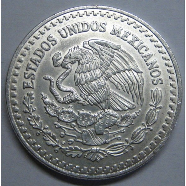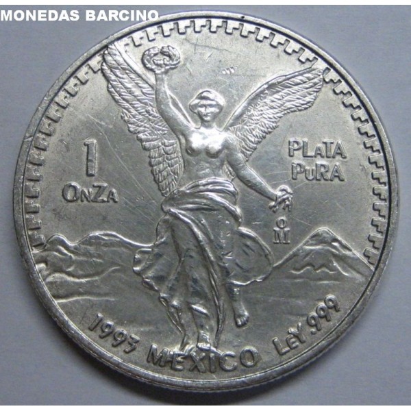 Moneda de Mexico estados Unidos Mexicanos año 1993 de valor 1 Onza plata pura Liberty silver Bullion coins , ley silver plata 999 milesimas peso 31,1gramos y diametro 40mm. calidad MBC+ limpiada, rayitas. .
