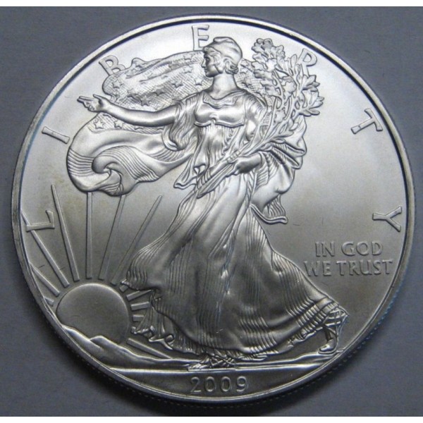 Moneda de Estados Unidos America año 2009 Usa. Moneda Liberty Bullion Coins de Valor 1 onza Troy 1 dollar de plata 999 mls. clasificacion KM-273. conservacion sin circular leves sombras. Peso: 31,1010 grs. - Diametro: 41 mm. ANV. DESIGNER: ADOLPH A.WEINMAN . REV. DESIGNER: JOHN MERCANTI.