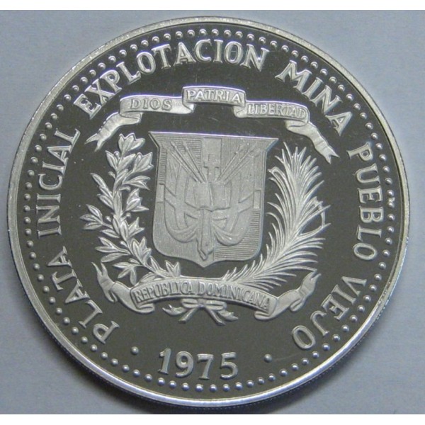 Moneda de la republica Dominicana año 1975 de valor 10 pesos de plata 900 mls. Moneda conmemorativa del ARTE TAINO Plata inicial Explotacion Mina. Pueblo Viejo. Moneda con capsula calidad proof peso. 30gr. diametro 40mm. ver la imagen fotografiada