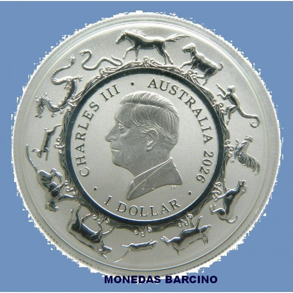Moneda de Australia año 2026 1 onza troy silver 999 mls. de valor 1 dollar de plata fina 999 mls. Moneda Conmemorativa del Año Lunar del Caballo Horse 2026 rey CHARLES II . moneda con capsula calidad sin circular .