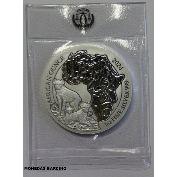 Moneda de Ruanda año 2026 coin RWANDA AFRICA de valor 50 Aamafaranga onza de plata 999. Moneda conmemorativa de las Hienas. Moneda sin circular con funda de plastico Original.