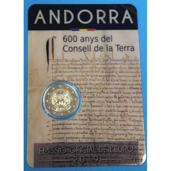 Moneda de euros de Andorra año 2019, Moneda de 2 euros conmemorativa de Andorra 600 ANYS DEL CONSELL DE LA TERRA Emision Oficial de el Euro,Euros de europa, Moneda en coincard Original.El diseño de la moneda representa el Monumento a los hombres y mujeres de Andorra que quisieron la Constitución.