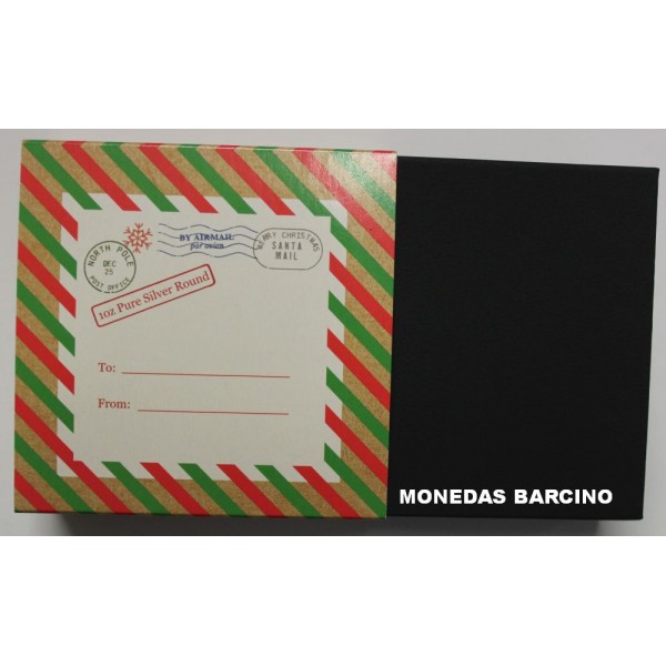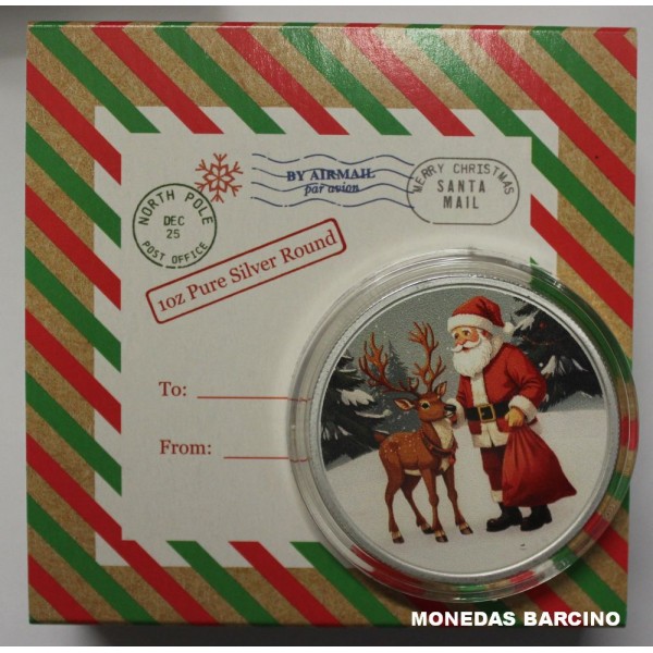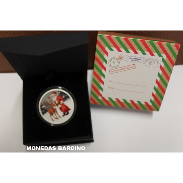 Moneda Onza año 2025 de valor 1 onza troy silver de plata 999 mls. Moneda coloreada de la Santa Claus. Made at The North Pole. Proof con capsula y estuche original.