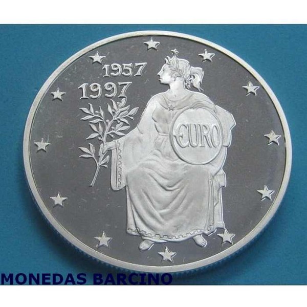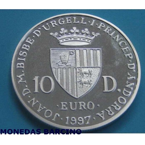 Moneda del Principado de Andorra año 1997 ANDORRA de valor EUROS 10 DINERS ECU Moneda Conmemorativa del Teatro de Roma Joan D.M. Bisbe De Urgell I Princep de Andorra calidad Proof la monedade la imagen fotografiada