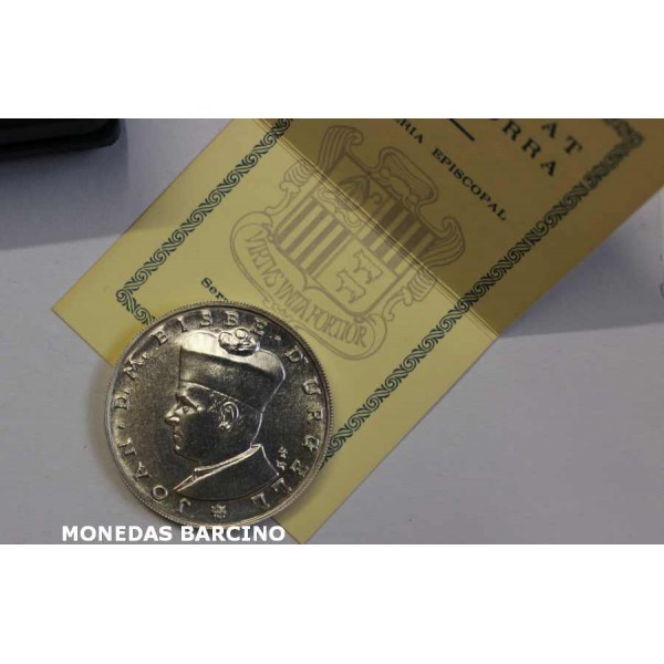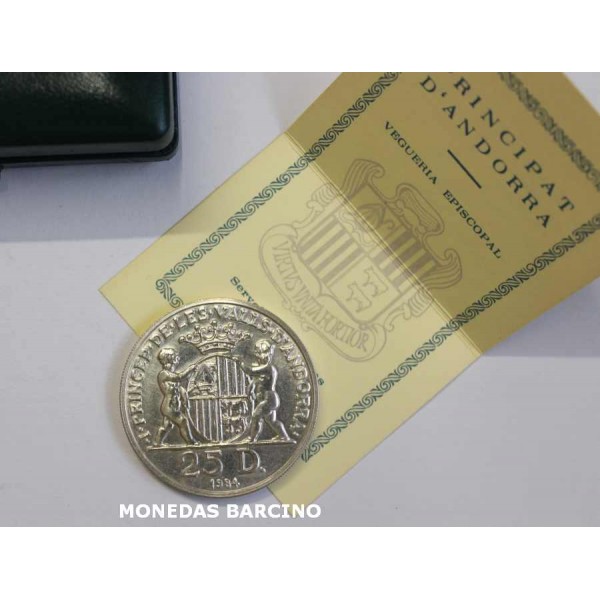 Moneda del Principado de Andorra del año 1984 de valor 25 diners de plata 900 mls. Moneda conmemorativa del BISBE BENLLOCH Joan D.M. Bisbe De Urgell I Princep de la Valls de Andorra. calidad sin circular la moneda con estuche y certificado oficial. ver las imagenes fotografiadas