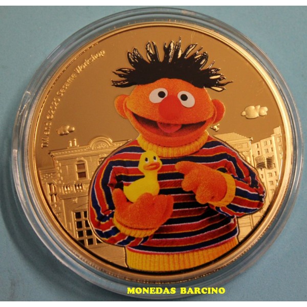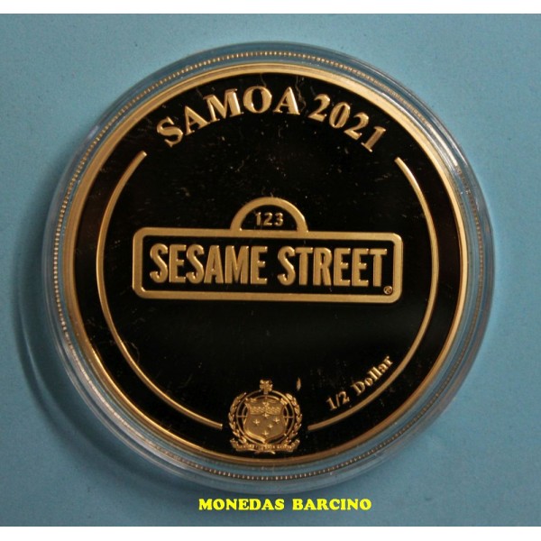 Moneda de SAMOA año 2021 de valor Medio Dollar doradas . moneda conmemoratica del personaje de Barrio sesame Epi . Sesame Street Cookie Monster moneda dorada y con color ley CU/NI Diametro: 45mm. peso 39gr. con capsula.calidad sin circular.