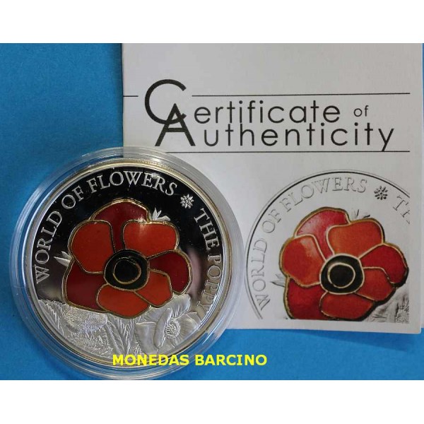 Moneda de Cook Islas año 2012 5 dollars. Moneda conmemorativa de Flores del Mundo Flor Relieve, World of Flowers The Poppy Amapola , Reina Elizabeth II. calidad Proor, Flor con Relieve de color, Coloreada, con capsula y certificado de Autenticidad
