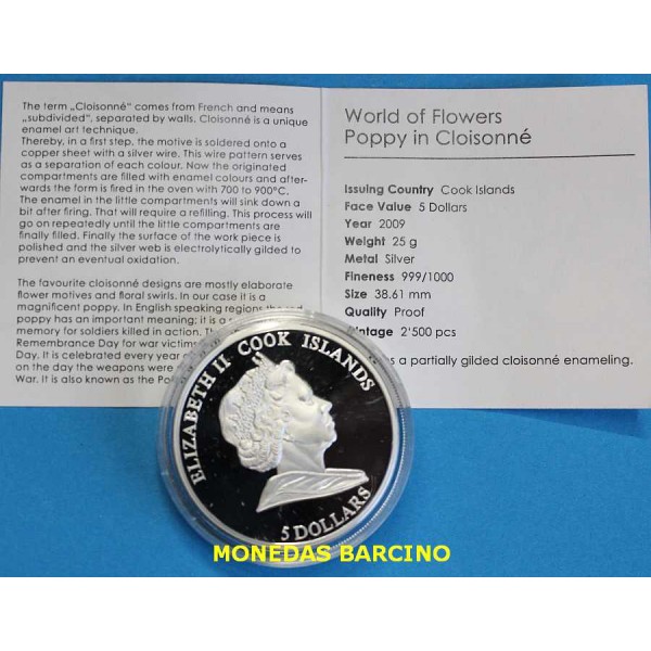 2009- COOK ISLANDS -5 DOLLARS - AMAPOLA - PLATA - COLOR