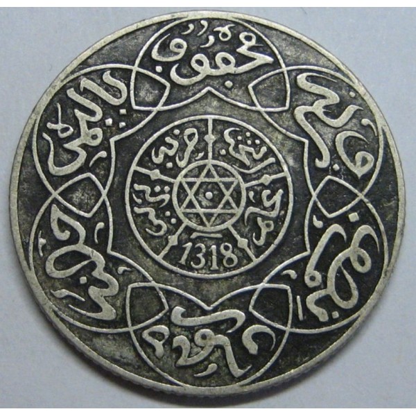 Moneda de marruecos Marocco Maroc año AH 1318 Paris (1901) de valor 2 1/2 Dirhams de plata 835 mls. Moneda de Abdelaziz . conservacion MBC+. ver imagen fotografiada