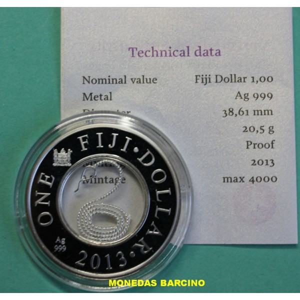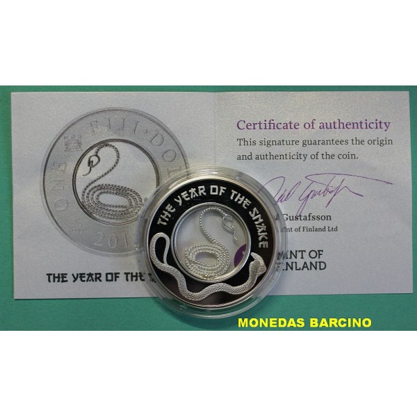 Moneda de la Republic of Fiji año 2013 de valor 1 dollars de plata silver 999 mls. Moneda Conmemorativa del Horoscopo Chino año de la Serpiente. The year of The Snake. - Mint of Finland. Serpiente de hilo de plata. Moneda con Capsula y Certificado Oficial . calidad Proof. ver imagenes