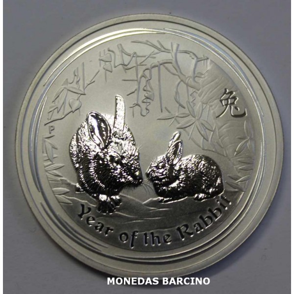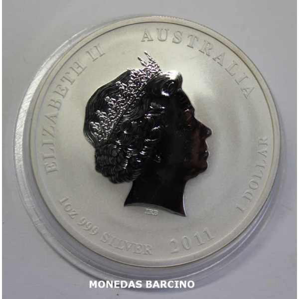 Moneda de AUSTRALIA año 2011 valor 1 ONZA troy silver 1 DOLLAR de plata Reina Elizabeth II: Moneda Conmemorativa de la Serie Lunar Horroscopo Chino año del Conejo Liebre.- Year of the Rabbit . con capsula sin circular muy bonita. plata 31.10 grs silver 999 milesimas y de Diametro 45 mm.