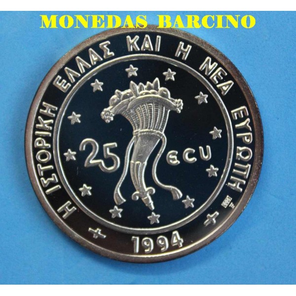 Moneda de grecia año 1994 de valor 25 Ecus de Plata fina 999mls. Greece Moneda conmemorativa del Panteon, Parthenon de Greece. calidad Proof. con capsula