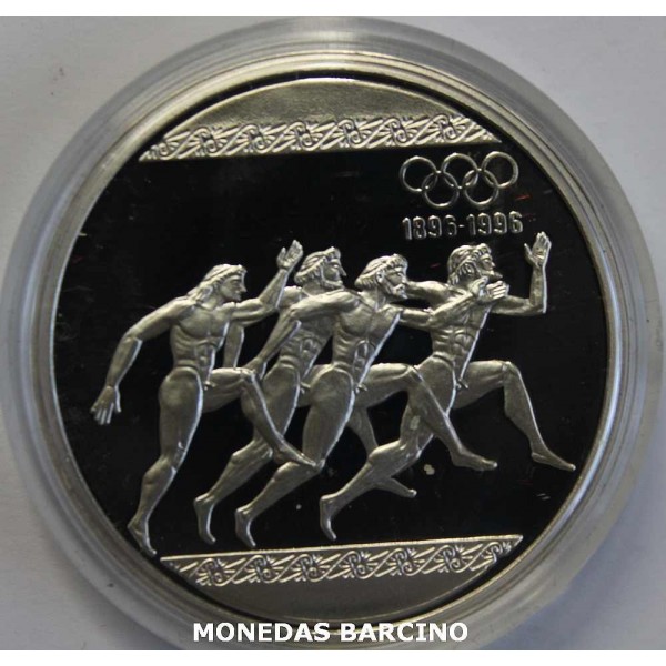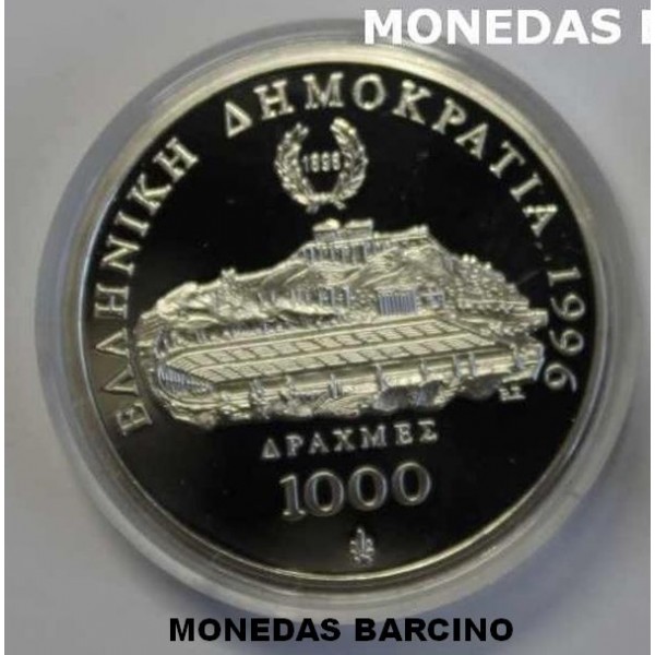 Monedas de grecia año 1996 de valor 1000 Dracmas de plata 925 mls. Moneda Conmemorativas del Aniversario del centenario de los juegos Olimpicos 1896 - 1996 .monedas con capsula. calidad Proof.