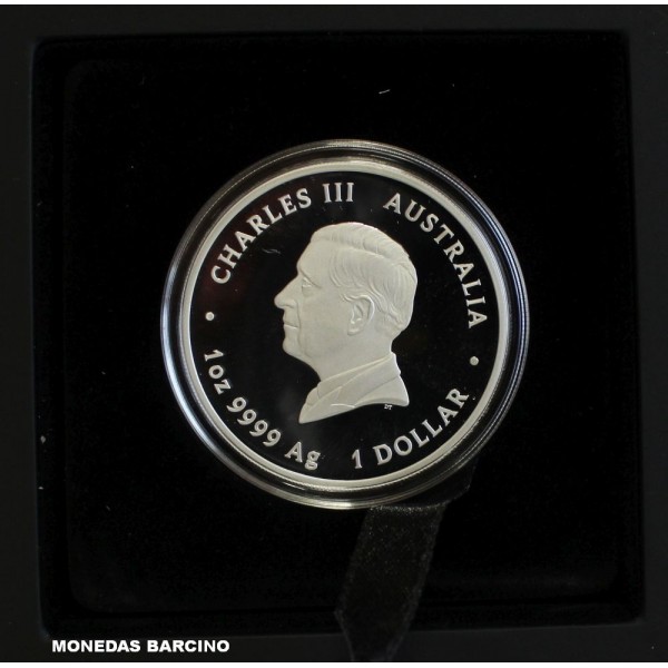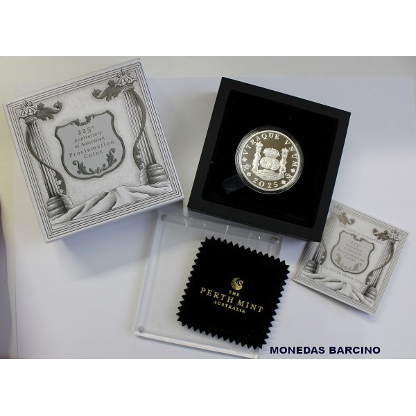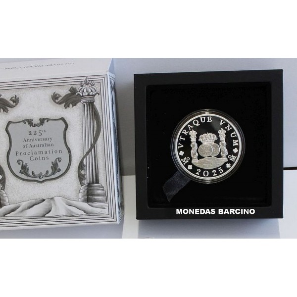 Moneda de Australia año 2025 onza troy silver 999 mls. de valor 1 dollar de plata 8 Reales Españoles corona real columnario. Calidad Proof. Moneda Conmemorativa Pillar Dollar 225 Aniversario de las monedas de la proclamacion Australiana. rey Carlos III . moneda presentada con estuche y certificado Oficial. Proof