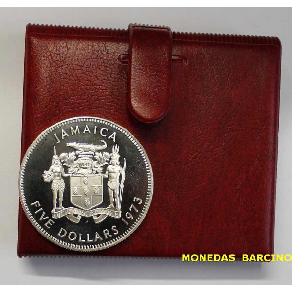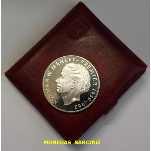 Moneda de Jamaica año 1973 de valor Five Dollars 5 dolares de plata 925 mls. , conmemorativa de Norman W. Manley premier 1959-1962. KM#59 . calidad Proof con leves rayitas peso 42,32gr. diametro 45mm. ver la imagen fotografiada.