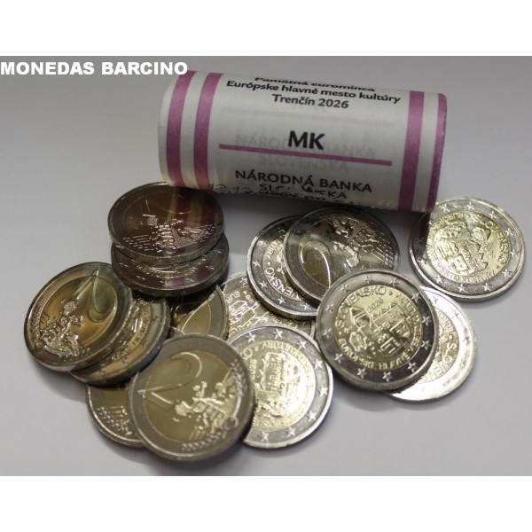 Monedas de Eslovaquia año 2026 de valor facial 2 euros conmemorativos de la capital europea de la cultura Trencin . Euros de la Union Europea de Slovensko. monedas nuevas sin circular de cartucho.