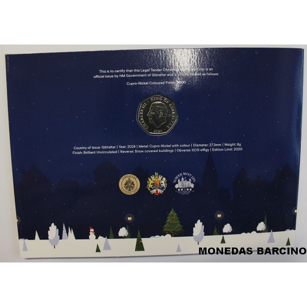 Moneda de Gibraltar año 2024 de valor 5 pence Fifty pence coin . del Rey Charles III Moneda conmemorativa Merry Christmas Feliz Navidad . calidad sin circular presentada en blister postal original, moneda coloreada