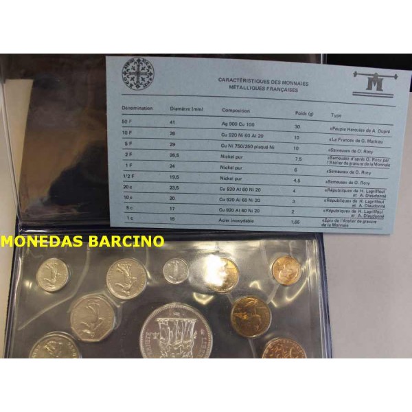 Coleccion de 10 Monedas de Francia año 1980 Monnaie de paris. de valores en francs y centimes. 50 francos de plata 900 mls. 10 francs.-5 francs.- 2 francs.- 1 francs. 1/2 francs. 20 centimes. 10 centimes .- 5 centimes.- 1 centimes.- MONNAIE LIBERTE- EGALITE- FRANTERNITE. Las monedas perfectas sin circular en estuche y certificado. el plastico esta arrugado,