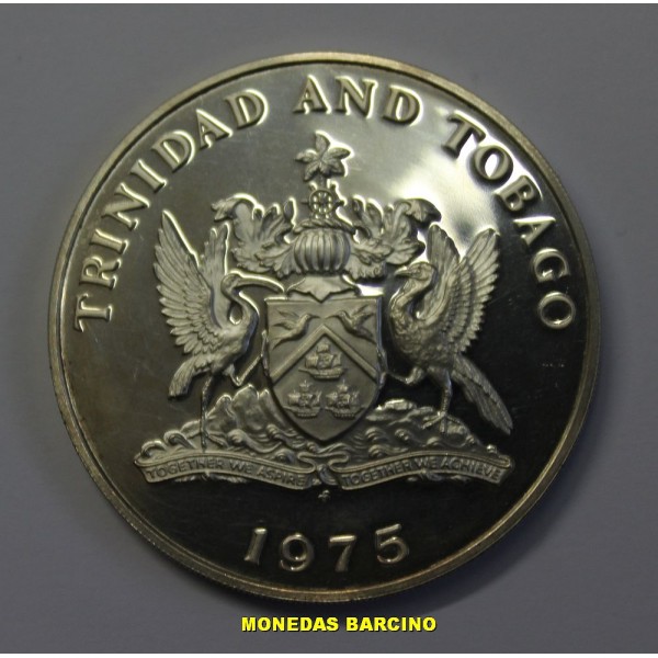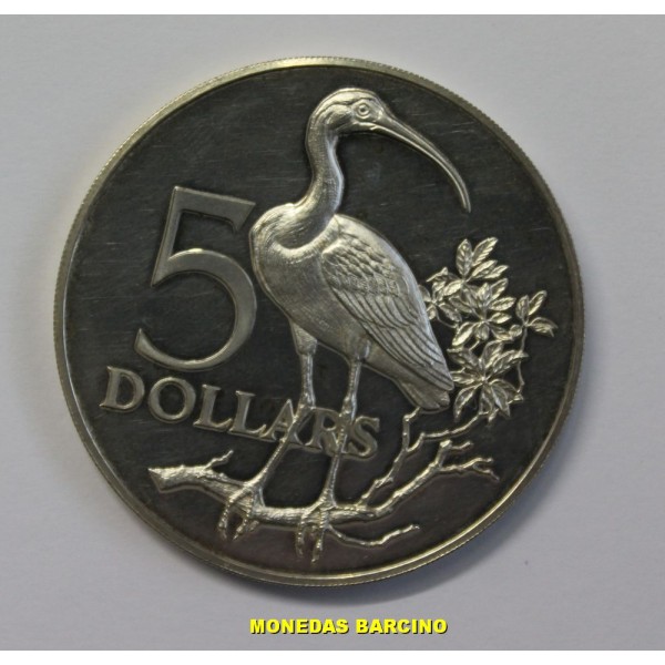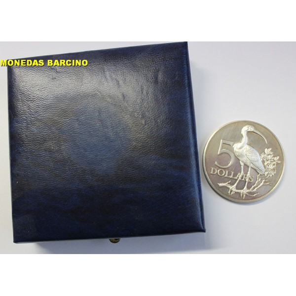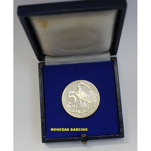Moneda de Trinidad y Tobago año 1975 de valor 5 dollares de plata. Moneda conmemorativa de Scarlet Ibis . Ley Plata silver 925 milesimas peso 29,70 gramos - diametro 40 mm. moneda Proof leves sombras. ver imagen fotografiada .