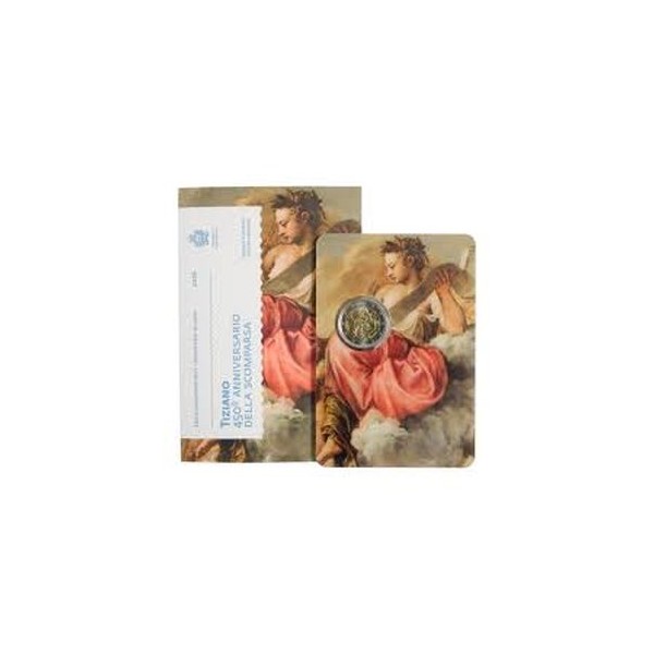 Moneda de Republica de San Marino año 2026 de valor facial 2 Euros Conmemorativos del 450 Aniversario de la Muerte del Pintor Italiano de Tiziano. Segretaria di Stato Finanze e Bilancio. Moneta fior di conio Sin circular en blister original oficial.