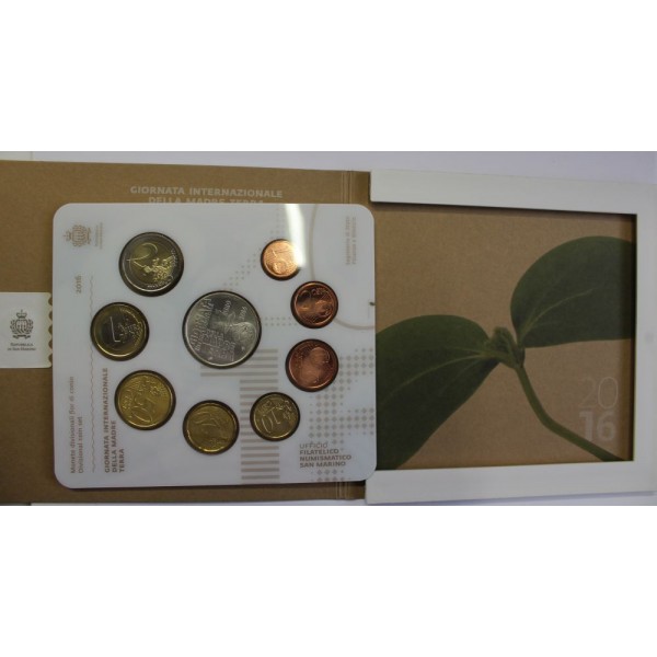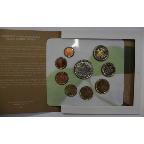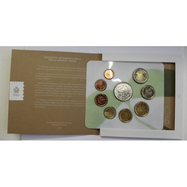 Monedas de la republica de San Marino . Monedas conmemorativas de La Giornata Internazionale della Madre Terra. coleccion Euros de 8 Monedas de 2 euros 1 euro. 50 centimos. 20 centimos. 10 centimos- 5 centimos- 2 centimos- 1 centimo- y 5 Euros de plata 925 mls. Coleccion de 9 monedas de San Marino Oficial en Blister. Año 2016.