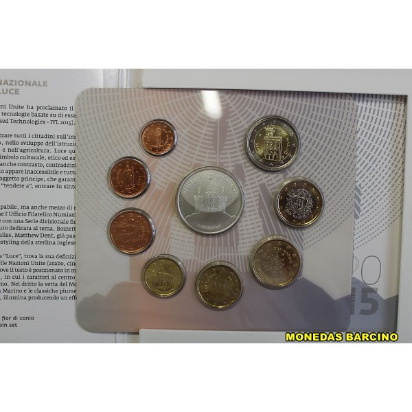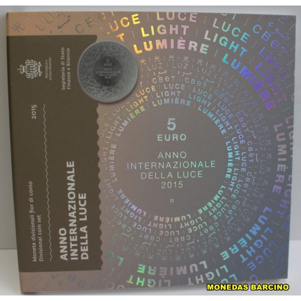 Monedas de la republica de San Marino .año 2015. Monedas conmemorativas del Anno Internacional della Luce. Luz. Coleccion Euros de 8 Monedas de 2 euros 1 euro. 50 centimos. 20 centimos. 10 centimos- 5 centimos- 2 centimos- 1 centimo- y 5 Euros de plata 925 mls. Coleccion de 9 monedas de San Marino Oficial en Blister. Año 2015.