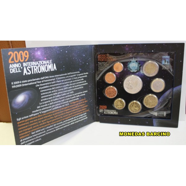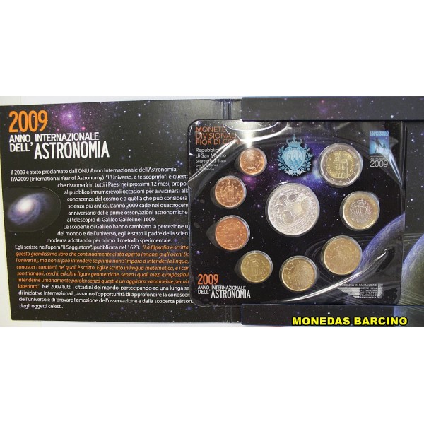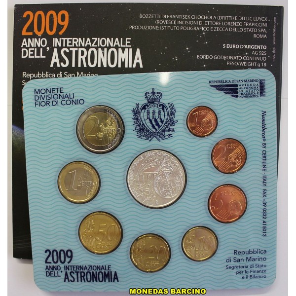 Monedas de la republica de San Marino. año 2009. Coleccion Euros de 8 Monedas de 2 euros 1 euro. 50 centimos. 20 centimos. 10 centimos- 5 centimos- 2 centimos- 1 centimo- y 5 Euros de plata 925 mls. Monedas conmemorativas del año internacional de la Astronimia Coleccion de 9 monedas de San Marino Oficial en Blister. Año 2009.