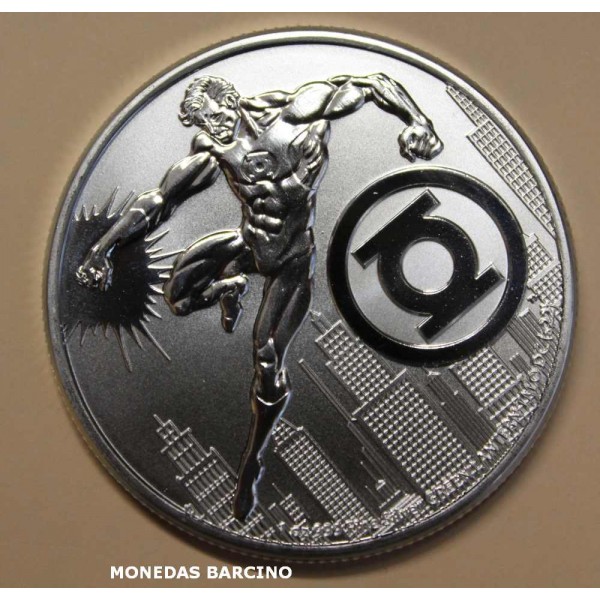 Moneda de NIUE islas año 2022 1 ONZA troy silver de valor two dollars 2 Dolares de Moneda conmemorativa de La Liga de la justicia super heroe Linterna Verde conservacion sin circular muy bonita en bolsita. de Ley Plata fina 9999 milesimas .