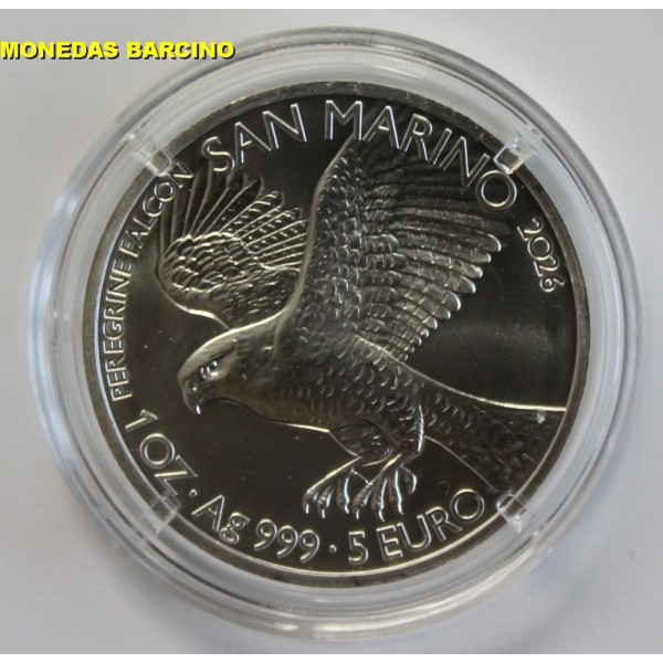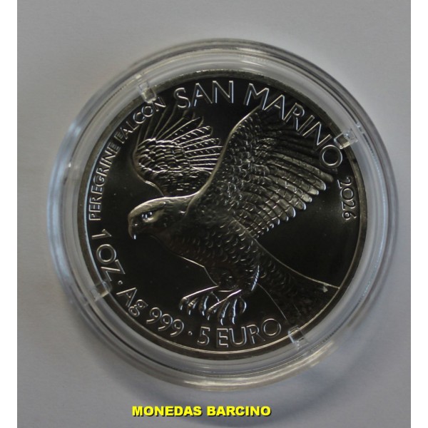 Moneda de la republica de San marino año 2026 de valor facial 5 euros de plata 999 mls. Moneda conmemorativa dedicada al Halcon Peregrino Falcon. Onza. la moneda sin circular con Capsula.