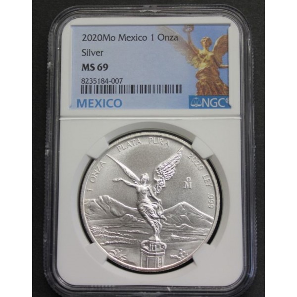 Moneda de Mexico Estados Unidos Mexicanos año 2020 de valor 1 Onza plata pura 999 mls. Liberty silver Bullion coins. peso 31,1gramos y diametro 40mm. NGC MS 69